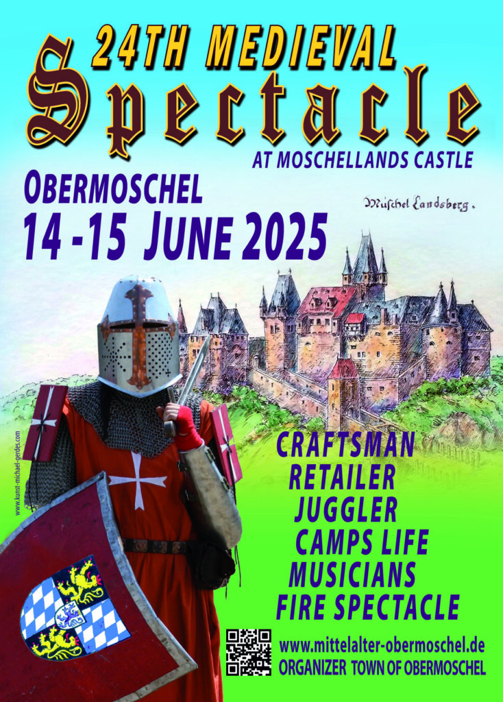 Auch im Jahr 2025 veranstaltet die Stadt Obermoschel am 2. Juniwochenende wieder ihr mittelalterliches Spectaculum. Am 14. und 15. Juni findet die beliebte Veranstaltung bereits zum 24. Mal in der Ruine der Moschellandsburg statt. Diese thront hoch über der kleinsten pfälzischen Stadt auf einem Felssporn und bietet einen spektakulären Ausblick auf das Nordpfälzer Hügelland.